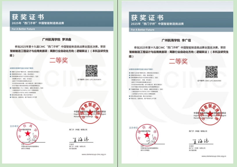 西门子杯中国智能制造挑战赛作为国内极具影响力的赛事,吸引了众多高校的积极参与。本届决赛规模盛大,共有384 所学校、927 支队伍、3000 多名学生同台竞技,竞争异常激烈。面对来自浙江大学、哈尔滨工业大学、同济大学等众多“双一流”高校的强劲对手,在如此激烈的角逐中,罗泽鑫与李广信两位同学迎难而上,在备赛期间反复打磨控制方案,深入研究逻辑算法结构,优化程序运行效率,历经多日备赛,最终功夫不负有心人,取得总决赛二等奖的好成绩。此次获奖,充分展现了广州航海学院学子不畏强手、勇于拼搏的精神风貌和扎实的专业实力。