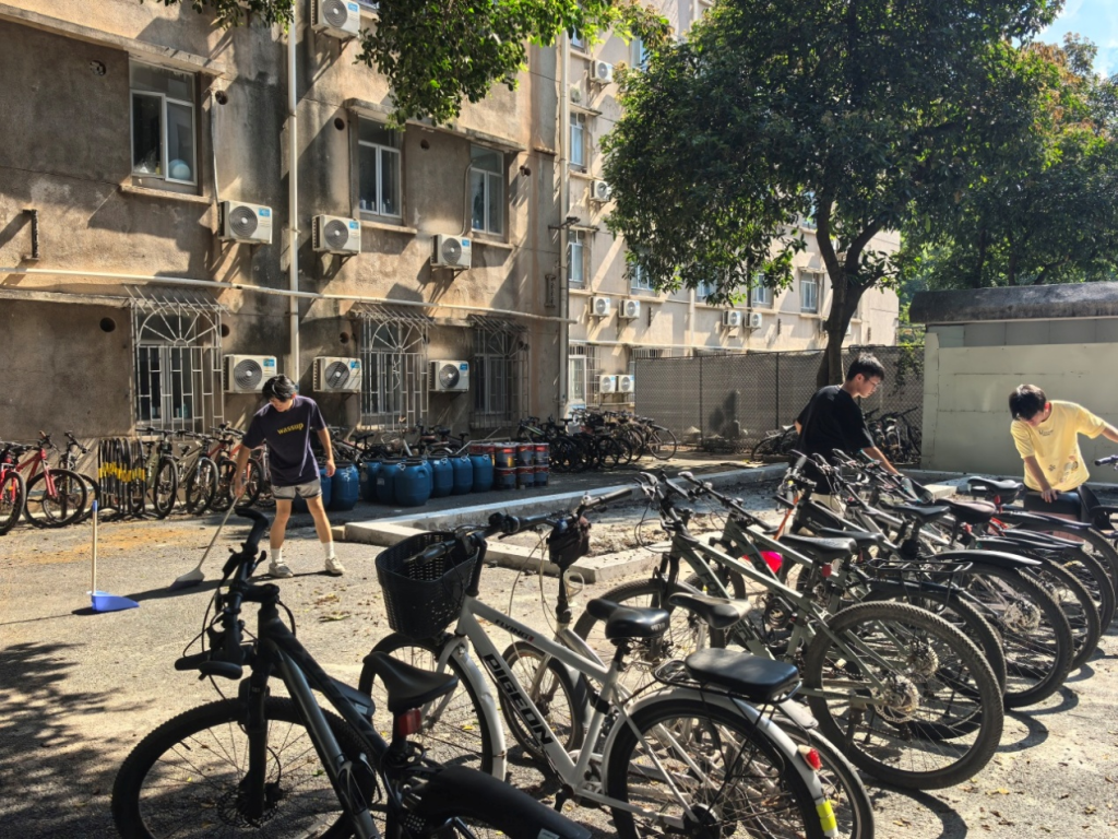 下午2时许,老师与志愿者在校园生活区集结,迅速投入环境整治工作。活动以“全域清洁、精细治理”为目标,志愿者分工协作,清扫路面,手持工具清理落叶杂物,车辆归置组规范自行车停放秩序,细节清洁组擦拭公共区域设施,实现卫生死角“清零”。