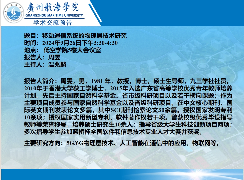 “低空翱翔”学术交流预告:周雯教授 《移动通信系统的物理层技术研究》